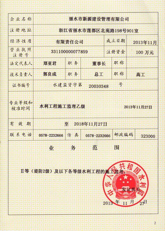 水利工程施工監理資質證書
